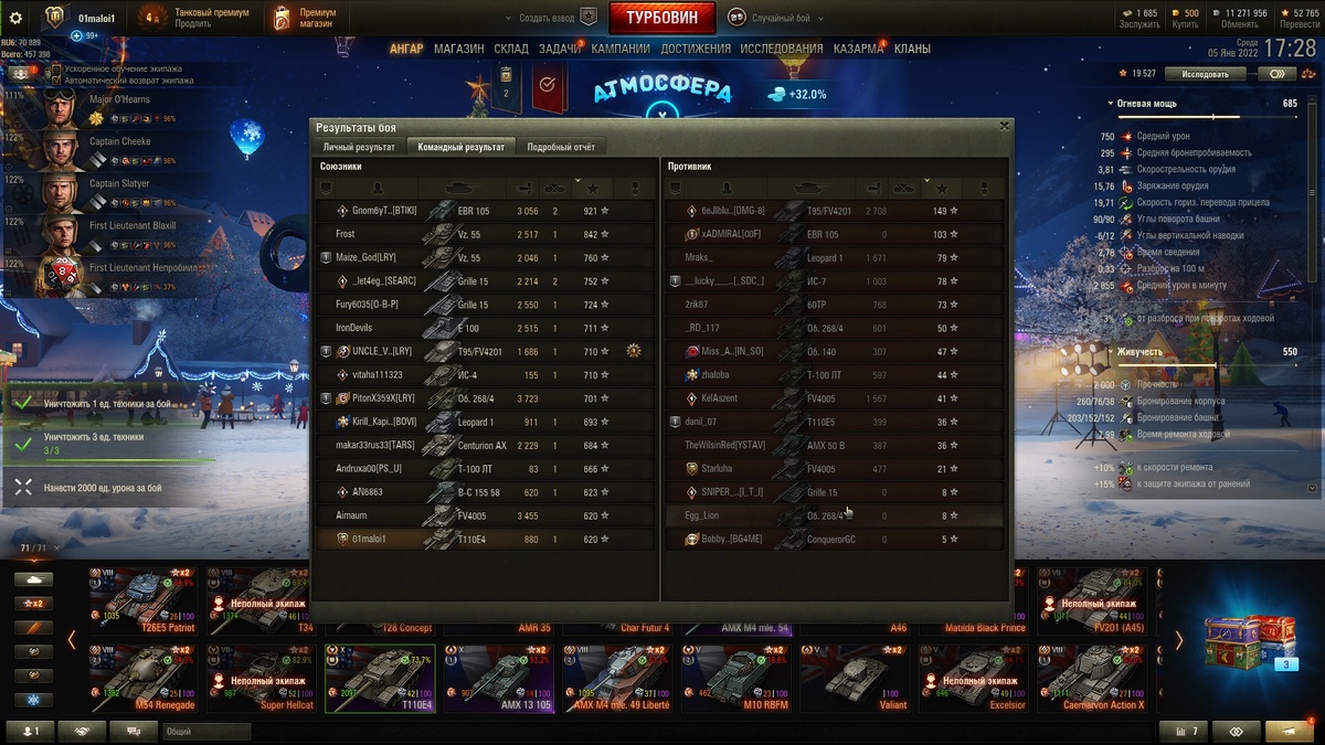Знаете чем лично мне , да я думаю и можно сказать адекватному меньшинству игроков не нравится в праздничной атмосфере в World of Tanks ? -крафт? -донат? Нет ребята . не этим. А чем спросите вы. вот результат боя через 5 минут Бой на 10 м уровне. Счет 15-0 длительность боя ровно 5 минут . Ты не успеешь никуда ни доехать ни настрелять.Думаете кому то нравятся такие бои -кроме неадекватного большинства? Нет ни интриги , ни по сути боя . Это как в том анекдоте : Вышли 4 мужика рыбу играть -раздали кости, тут же положили на стол-на вас 6 очков. То есть они уже все просчитали и сосчитали. Так и тут ,особенно на праздники , создаются такие команды для быстрого слива-быстрый слив -быстрый следующий бой -и так по кругу . Вы давно видели серию долгих боев? лично я давно. Хотя еще много зависит от карты , но большие карты редкость в игре .В основном 2 направления.И в какой команде больше опытных игроков та и победит . Я согласен что такие бои могут иметь место. Но не через бой же .по пят