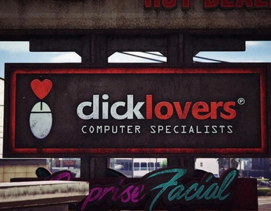 Click Lovers — сеть электротехнических магазинов в игре Grand Theft Auto V, которая специализируется на компьютерной технике. Из-за неудачно (очевидно, нарочно) подобранного шрифта, в названии легко читается «dicklovers», что вкупе с интересной стилизацией компьютерной мыши может создать совсем не компьютерные ассоциации😊 Suck It — изначально устройство в виде большого пылесоса для сбора игрушек (в последствие также для многих целей, в том числе сбора ядерных отходов, но это не так важно). Название, хоть и семантически вполне грамотно, всё же звучит совсем не по-детски — перевести его можно как «отсос»/«отсоси», «засоси»/«засоси». Устройство было придумано и разработано Дэвидом Уолессом из американского сериала The Office. Les Bos — бар «только для женщин» из мультсериала South Park. Несмотря на псевдофранцузское происхождение названия и верное произношение «ЛеБо», в надписи легко читается «ЛесБос», а все завсегдатаи бара — не просто женщины, но гомосексуальные) Heavy Petting — перево