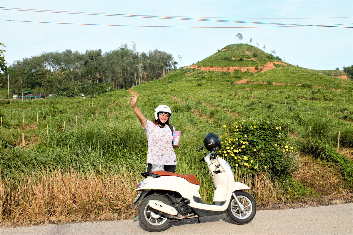 Наша цель - обзорка в красивейшем месте провинции Пхангнга. Я гнала со скоростью 80 км/ч, чтобы оказаться в этом моменте. Это чудесное воспоминание о завтраке в месте, где вряд ли бывают туристы. Мы поехали в объезд, чтобы поскорее приехать в пункт назначения. Впереди начиналось почти бездорожье. Вокруг нас нет ни души, только зеленые холмы, местные поля с огородами и небольшими постройками ближе к холму, и все это прекрасно дополняет музыкальное сопровождение Moby 😄
