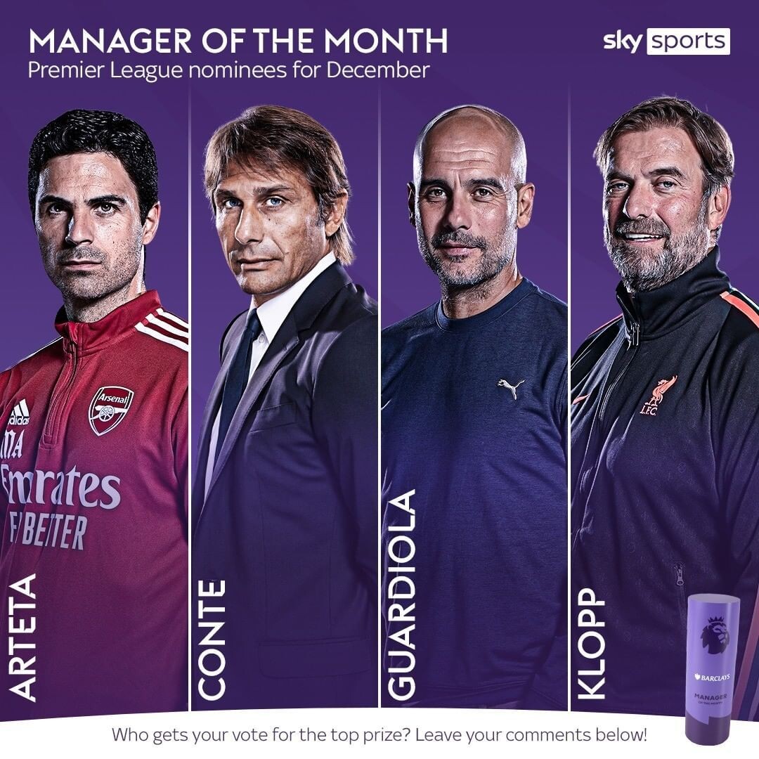 Стали известны претенденты на награду лучшему тренеру АПЛ в декабре. Приз могут получить Микель Артета («Арсенал», 4 победы в 2 поражения в 6 матчах), Пеп Гвардиола («Манчестер Сити», 7 побед в 7 матчах), Юрген Клопп («Ливерпуль», 4 победы, ничья и поражение) и Антонио Конте («Тоттенхэм», 3 победы и 2 ничьих). В ноябре лучшим тренером был признан Гвардиола.