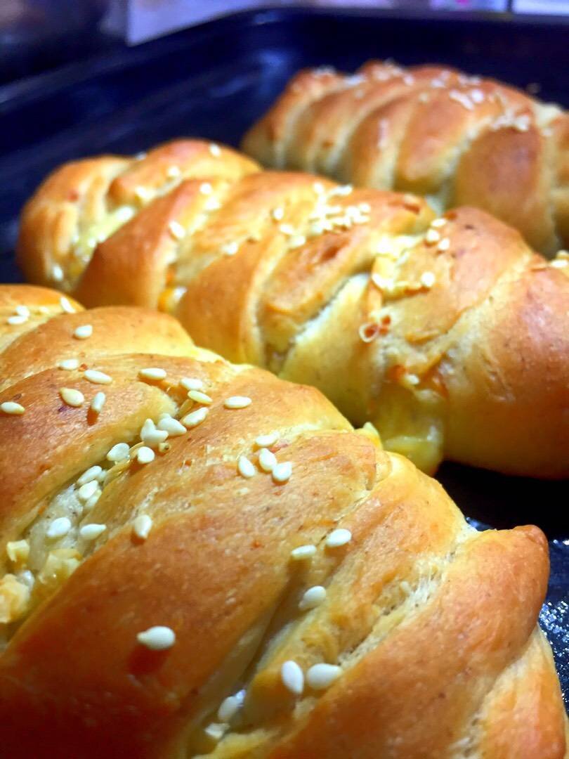 Ингредиенты: воды тёплой, тёплого молока, сливочного масла, соли, сахара, дрожжей, муки, Сыр сулугуни или адыгейский Способ приготовления: Молоко и воду вылить в миску, добавить мягкое масло, соль, сахар и дрожжи хорошо перемешать, высыпать муку и замесить тесто. Дать постоять в тёплом месте 20 минут. С теста формируем шарики, раскатываем на поверхности в лепешку в середину кладём сыр, бока разрезаем на полосочки. Готовые косички перекладываю на смазанный противень, посыпаю кунжутом и в духовке пусть постоят 20 минут, чтобы поднялись. Включаю духовку на 180 градусов и выпекаю до готовности.