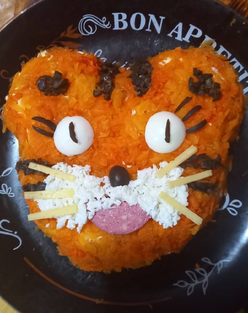 #новыйгод #салат #моирецепты Ингредиенты: Для салата:, вареных яйца, крабовых палочек, вареных картофелины, Зеленый лук, Соль, Перец черный молотый, Майонез, Для украшения:, вареной моркови, копченой колбасы, белка от вареных яиц, Маслины, Твердый сыр Способ приготовления: Приготовить салат, измельчив и смешав все ингредиенты. Сформировать из салата фигуру головы тигра. Обложить натертой морковью. Глаза сделать из белков и маслин. Рот из колбасы, щечки из тертых белков, усы -брусочки сыра, нос- маслины. Полоски на мордочке сделать из маслин. Дать постоять немного и - на стол! Приятного аппетита!