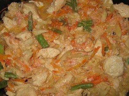 Овощи можно использовать любые. #основныеблюда #курица Ингредиенты: Филе куриное, Рис, Помидоры, Перец болгарский, Лук красный, Петрушка, Масло растительное Способ приготовления: Куриное филе нарезать крупными кусками и обжарить в глубоком сотейнике на растительном масле 5-7 мин. Добавить мелко нарезанные овощи и рис. Посыпать блюдо приправой (магги супер приправа 10 овощей) и залить водой. Тушить на медленном огне 15-20 минут. При подаче посыпать мелко нарезанной зеленью петрушки.