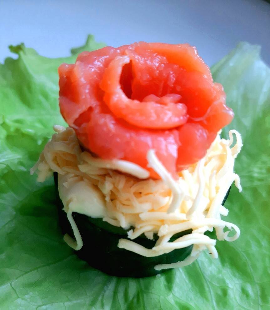 Неожиданные гости и вы не знаете что приготовить быстро и вкусно? Предлагаю очень быструю и очень вкусную, бюджетную закуску. Ингредиенты: Огурец свежий, Рыба красная, Майонез, Сыр твердый Способ приготовления: Огурец помыть, нарезать "бочонками" одинаковой высоты. Намазать огурцы немного майонезом. Сыр натереть на мелкой тёрке, положить поверх майонеза. Рыбу нарезать тонкими слайсами, свернуть колечками и уложить поверх сыра. Приятного аппетита!