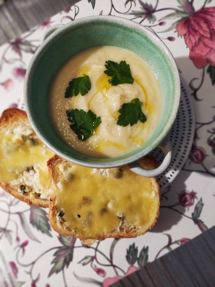 Ароматный и нежный #суп #вегетарианскоеблюдо #блюдобезмяса Ингредиенты: стебля порей (средней толщины), цветной капусты, маленькая луковица, чеснока, семена фенхеля, соль перец, петрушка, оливковое масло, сливочное масло Способ приготовления: В глубокой сковороде или в сотейнике с толстым дном, на смеси масел обжарить лук, лук порей. Когда оба лука поменяют цвет и станут мягкие, наломать соцветия цветной капусты и добавить в сотейник. Все обжарить до золотистого цвета и залить горячим кипятком. Всыпать специи и томить пока овощи не станут мягкие. Образовавшийся бульон перелить в отдельную ёмкость, а овощи перетереть. Влить бульон, столько сколько требуется для достижения нужной консистенции. Можно подавать полив сверху оливковым маслом и с гренками.