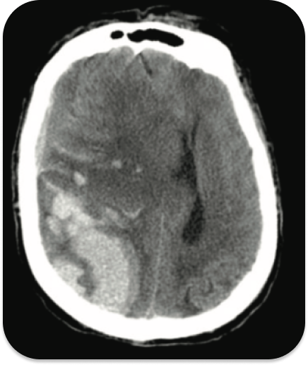 У этого пациента, получившего травматическую травму головы, обширное внутрипаренхиматозное кровоизлияние. Внутричерепное (например, внутрипаренхиматозное) кровоизлияние может вызвать значительный массовый эффект и повысить внутричерепное давление, что может проявляться судорогами и триадой Кушинга