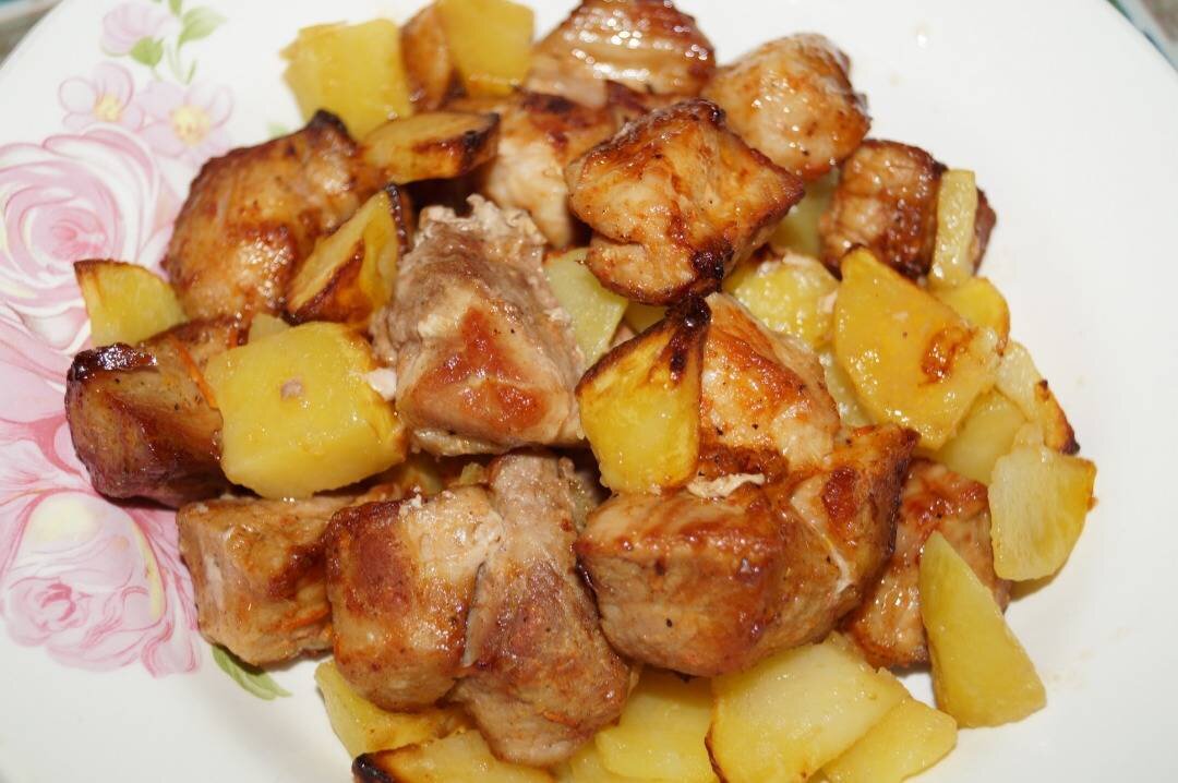 Ленивый шашлык, с картошкой на гарнир...#мультипекарьДелимано Ингредиенты: картофель в мундире, маринованное в кетчупе мясо свинины(окорок) Способ приготовления: Мясо положите в форму ровным слоем, пожарьте с одной стороны при 200 градусах, 15 минут. Переверните мясо на другую сторону, разложите между ним нарезанную на ломтики картошку. Включите мультипекарь на 10 минут, при 200градусах. И румяное мясо с картошкой будет готово, по истечении времени приготовления.
