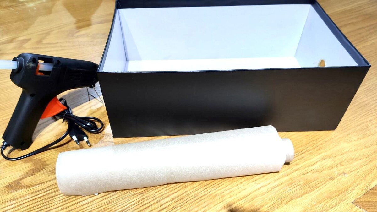Всем привет! Много полезных вещей можно сделать собственными руками. Одним из доступных материалов является бумага. Она просто обрабатывается, легко сгибается, режется, склеивается и подходит не только для детского творчества. Применяя этот материал, можно сделать привлекательные и практичные предметы интерьера. Самые популярные в быту - корзины для хранения, и они легко вписываются в обстановку дома. Использовать их можно где угодно: в ванной, прихожей, гостиной. Плетенные корзинки такие уютные и являются отличной заменой надоевшим пластиковым контейнерам. Если вы принадлежите к любителям натурального и экологичного, то предлагаю вам посмотреть оригинальную идею плетенной корзинки из пергаментной бумаги для запекания. Для работы, как вспомогательный предмет понадобится картонная коробка любого размера и горячий клей. Подходящий размер у коробки от обуви. В подобных корзинах можно хранить сезонные вещи, например шапки, шарфы, перчатки или полотенчики в ванной комнате. Если вы вяжете и