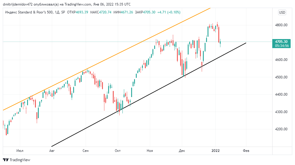 Фондовый рынок США торгуется пока разнонаправлено. Стоило упомянуть падение, которое может нагрянуть и оно произошло. В этом обзоре также напишу ситуацию по индексу и общую рыночную ситуацию, а также ряд американских компаний. Индекс S&P 500: Что по рынкам в общем? Вчера по итогам заседания мы немного просели, но как видите – падать еще есть куда. На мой личный взгляд – я считаю, что если даже мы сегодня и отрастем немного, то это не сильно исправит положение и угроза дойти ниже еще будет существовать. Мое видение – дойдем вновь до нижней границы и оттуда уже вновь начнут выкупать рынок, так как пока что участники рынка просто паникуют из-за скорейшего сворачивания стимулов, но сами стимулы пока не начали сворачивать и все еще впереди. Поэтому мы не пробьем линию тренда, а скорее всего оттолкнемся от нее и продолжим динамику. В момент X, да весь трендовый канал будет нарушен и может быть сильное падение рынка, но когда оно произойдет точно – вам никто не сможет сказать достоверно. В л