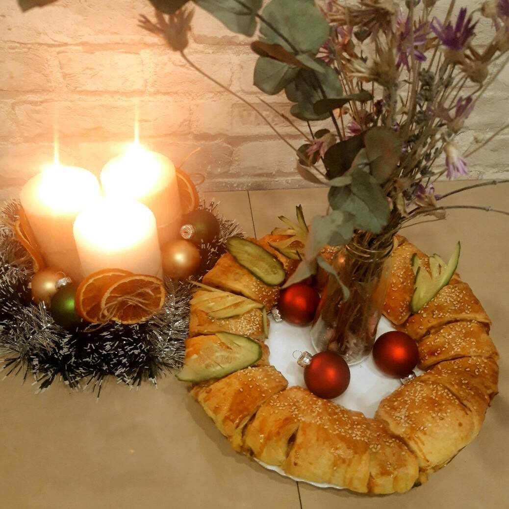 С Рождеством!!! Ингредиенты: слоеного теста, вареная куриная грудка, грибов обжареных с луком, сыр , кунжут, яйцо для смазки Способ приготовления: Тесто разморозить и раскатать вдоль, порезать на треугольники. Сложить треугольники в круг. Грибы обжарить с луком. Грудку отварить и порезать мелко. Добавить половину взбитого яйца для смазки. Выложить мясо по кругу, так же грибы и сыр натертый на терке.. Свернуть каждый лучить немного в рулетик и накрыть начинку. Смазать яйцом и посыпать кунжутом. Выпекать при t° 180 до готовности. Минут 30. Украсить нужно укропом, я о нем забыла. Поэтому скромно огурцом!!!!