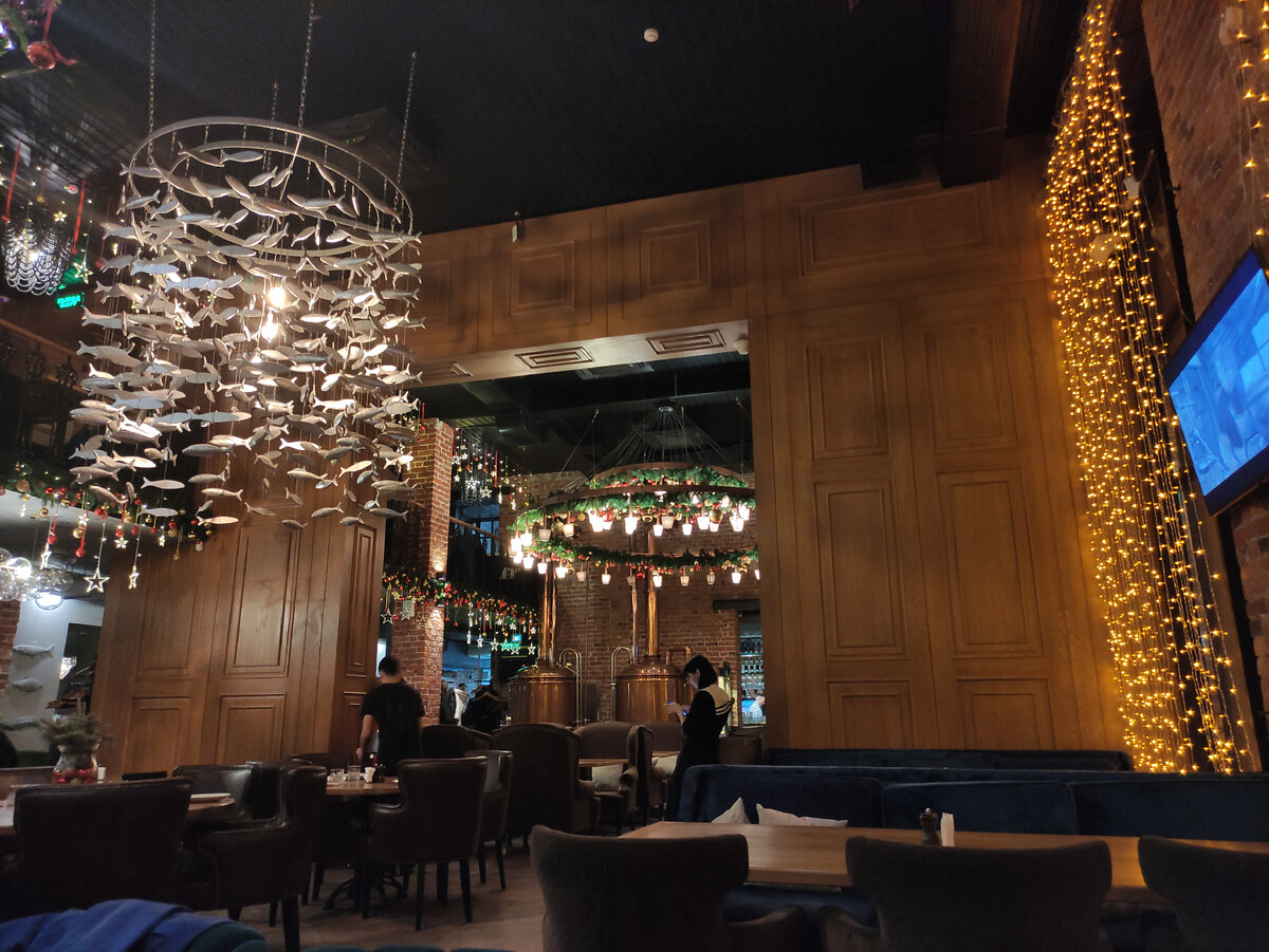 Интерьер очень стильный, сделанный со вкусом, в модном направлении - лофт. На стенах сочетание красного кирпича, благородного дерева, медных труб и серого нейтрального фона с выгравированными рыбами. На потолке чередование огромных люстр с десятками ламп и фантазийных декоративных элементов, состоящих из сотен мелких рыбешек.