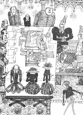 Король спросил у Кошки о том, какого она о нем мнения. Она сказала, что не особенно высокого. Король страшно возмутился и сказал, например, что к нему на консультации съезжаются профессора со всех концов земли. А потом спросил, много ли она знает. Кошка сказала, что знает все на свете. Король возмутился еще сильнее и потребовал доказать это. Он хотел ей задать три вопроса, но Кошка поставила свои условия: сначала задает вопросы Король, потом она. Кто из них победит, тот и будет править Королевством. Король самонадеянно согласился.
