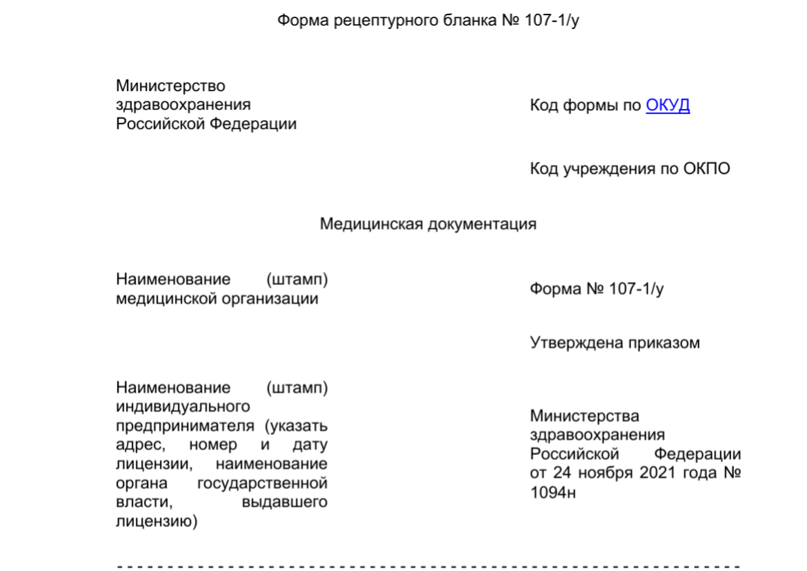 С 1 марта 2022 года начнет действовать приказ Минздрава от 24.11.2021 № 1094н. Он определяет новый порядок заполнения рецептов. Что нужно знать о новых правилах заполнения рецептов Рецептурный бланк формы № 107–1/у. Рецептурный бланк формы № 107–1/у надо будет оформлять на некоторые комбинированные препараты (приложение 3 к приказу о назначении лекарств). Новые правила оформления рецептов 1. Как указывать дозировку Дозировку лекарств системного действия в твердой и сыпучей форме можно писать в граммах и миллиграммах — для одного или нескольких действующих веществ (раньше указывали в граммах). В жидких формах дозировку можно писать в миллиграммах или миллилитрах с указанием общего объема (раньше — в мл, г и каплях) 2. Как писать название препарата Препарат можно указать в рецепте тремя способами: 3. Как указывать рекомендации по применению Обязательно указывать путь введения лекарства — подкожно, внутримышечно или перорально. Как и ранее, нужно прописывать дозу, частоту, длител
