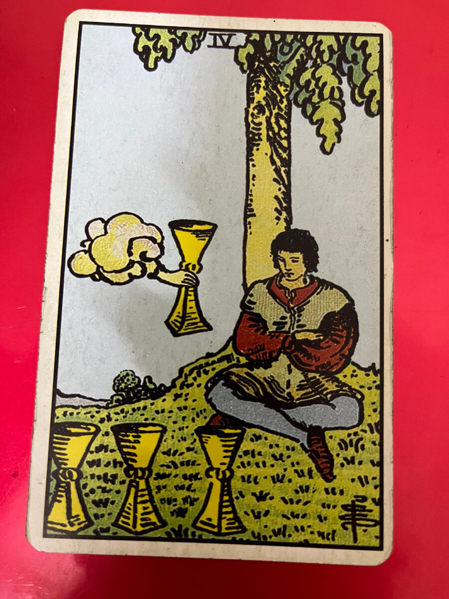 Четверка кубков говорит нам о закрытости, этот человек закрылся, человек обиделся, либо он показывает характер, это такая вот нехочуха, ему предлагают, он не берет, то есть и к нему вроде тянешься, он закрыт, здесь нет эмоций, человек не хочет брать, и это не безразличие, это все-таки больше закрытость, то есть здесь человек закрывается вниз какие-то причины, закрыться либо обида либо это его характер.