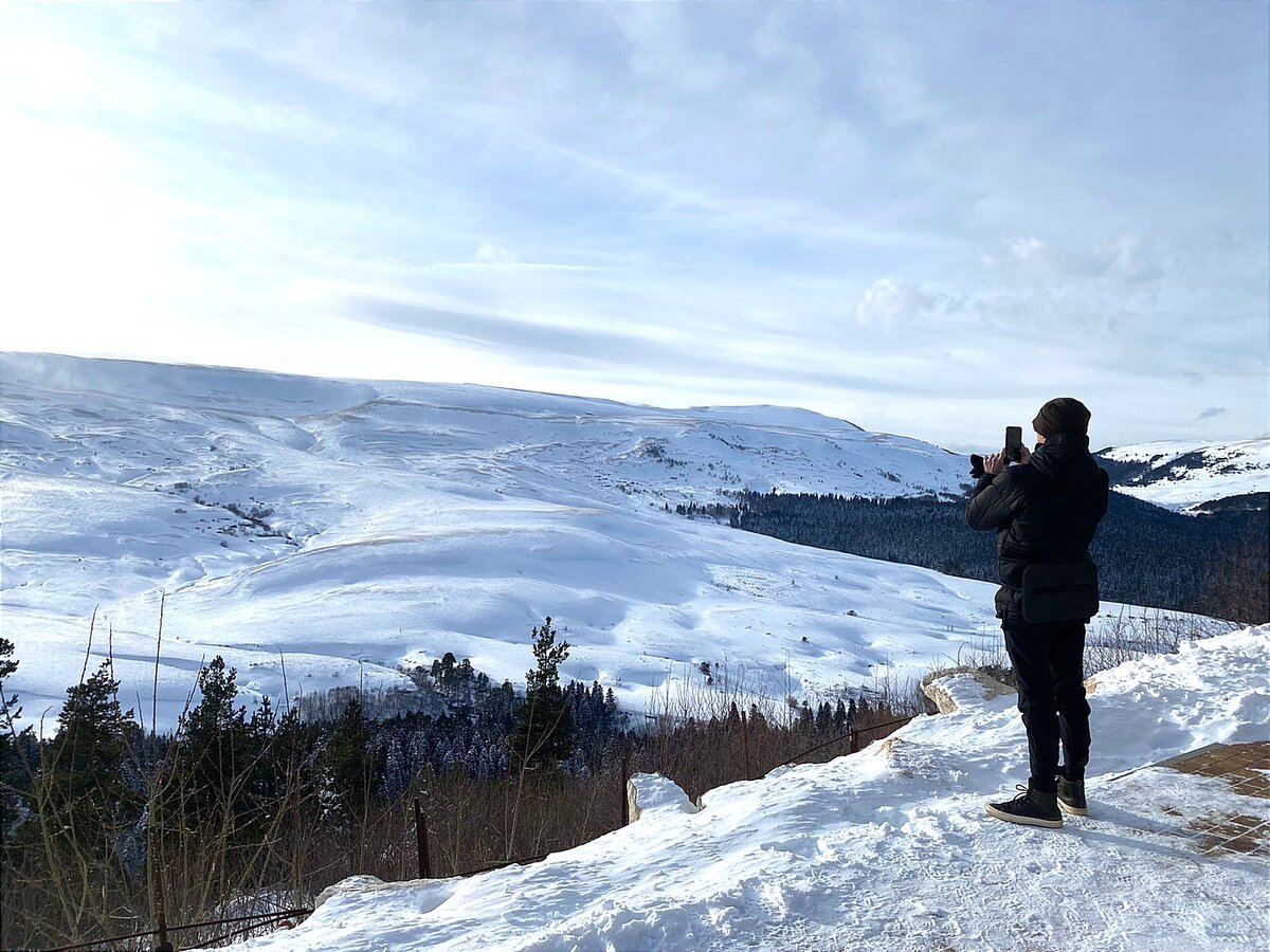 Всем привет! У нас в стране есть удивительные места для зимнего отдыха. И к ним я могу смело отнести Лаго-Наки. Этот курорт - конкурент Красной Поляны в Сочи. Но, по понятным причинам, менее известный. Находится он в горах Адыгеи. И сюда мы приехали на один день. Погода выдалась чудесная: морозно, но не очень холодно. Лежит снежок. Добрались до места и сразу попали на мини-выставку. В здании Кавказского Биосферного заповедника оформлена колоритная стена: Конечно же, на фоне неё многие туристы фотографируются. Это вещи самых настоящих покорителей гор. Сразу вспомнились фильмы об альпинистах. Возле каждого экспоната - поясняющая табличка. Вот - примус, вот - ледоруб, а рядом спальный мешок. Как будто только вернулись из похода. Ещё и мотивирующие плакаты из прошлого: "Путешествуйте по горам Кавказа". Вдохновившись, можно выбрать для себя эколого-туристический маршрут. Они разной протяженности и сложности. Одни ведут к водопадам, другие к загадочным пещерам. А ещё через горы можно вый