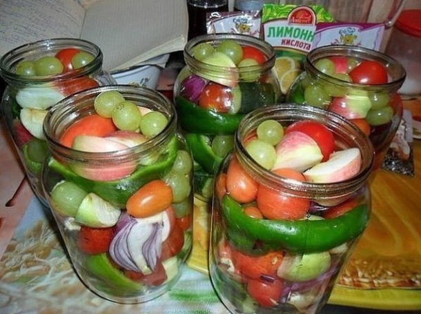 Разложить овощи,фрукты в банки и залить маринадом: