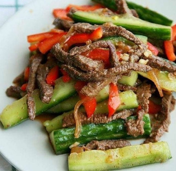 🥗Хорошенько разогреваем сковородку с растительным маслом, огонь должен быть сильным всё время готовки. Обжариваем мясо. Когда жидкость испарится, немного подрумяниваем, постоянно помешивая (1 минуту), сразу же добавляем лук, перемешиваем. Затем соевый соус, жарим ещё пару минут, перемешиваем и тут же выливаем всё содержимое сковороды на огурцы
