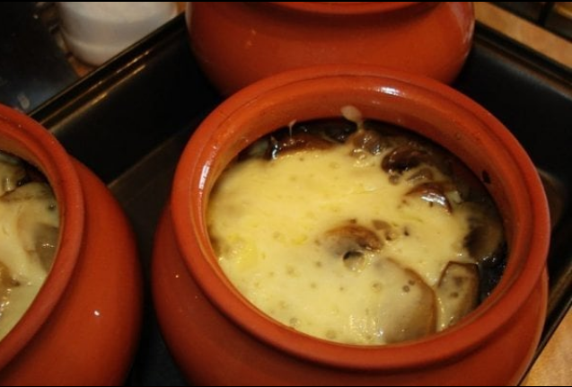 6 Готовить мясо в горшочке с шампиньонами и сыром 20 минут при температуре 180 градусов.