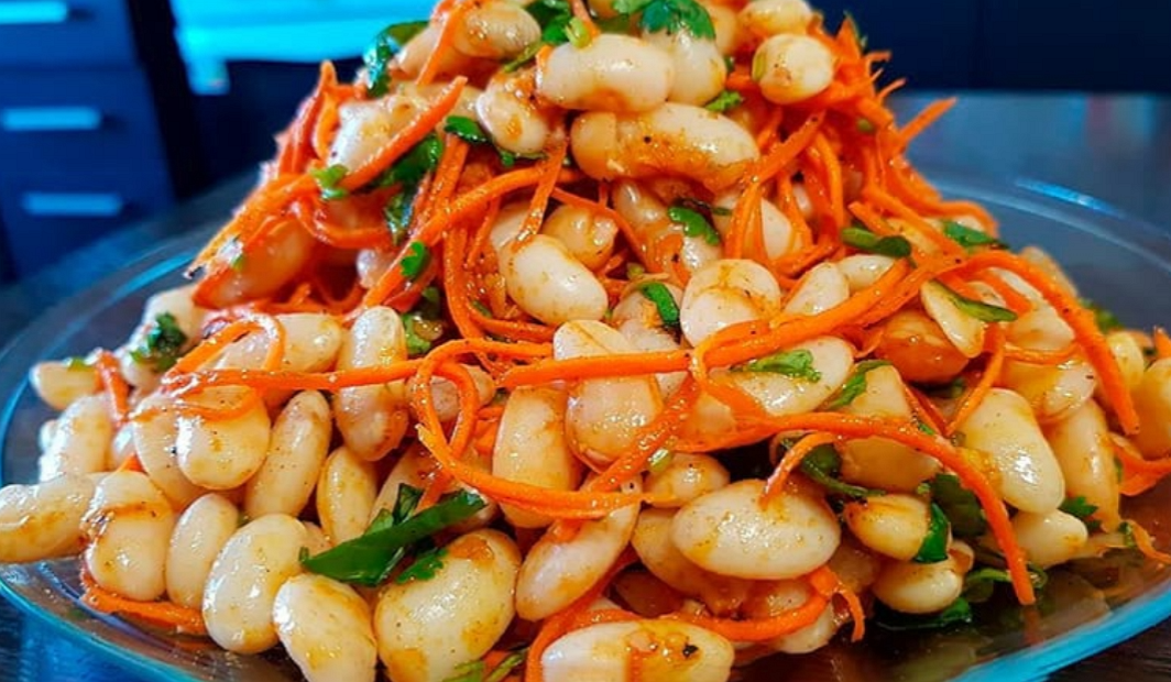 Рецепт довольно прост и не требует большого количества продуктов. Получается очень вкусное, ароматное блюдо, которое также можно есть в пост. Ингредиенты: 320 г фасоли в собственном соку; средняя морковь 200 г репчатый лук 65 г 1 пучок кинзы; 2-3 зубчика чеснока; 1 ч. л. молотого кориандра; 0,5 ч. л. мускатного ореха; 1 ч. л. сладкой паприки; сахарозаменитель по вкусу соль, перец – по вкусу; 1,5 ч. л. 9%-го уксуса; 45 г растительного масла. Приготовление: Морковь натираем на терке для корейской моркови. Лук нарезаем полукольцами. В глубокий салатник высыпаем консервированную фасоль. Добавляем тертую морковь, соль по вкусу, сахарозаменитель и все специи. Сверху поливаем 9%-ным уксусом, все хорошо перемешиваем. На предварительно разогретую сковородку наливаем растительное масло, добавляем лук, обжариваем до золотистости. В центре салата делаем небольшое углубление. Через пресс выдавливаем туда чеснок. После того как лук обжарился, убираем его со сковороды, он нам не понадобится. Кипя