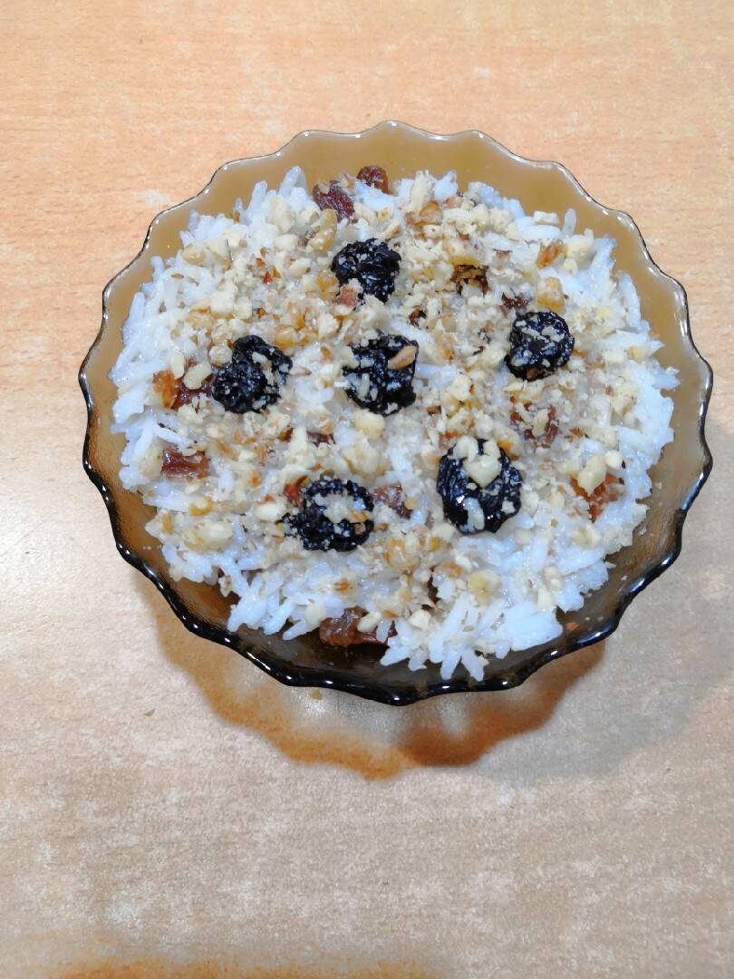 Ингредиенты: Рис, Изюм, Мед, Орехи Способ приготовления: Рис промыть, отварить в подсоленной воде. Промыть. Дать стечь. Изюм замочить в кипятке минут на 10. Орехи измельчить. Чайную ложку мёда развести в небольшом количестве воды. Рис смешать с изюмом, орехами, сахаром. Выложить в вазочку, полить медовой водичкой. Украсить орехами. Приятного аппетита.