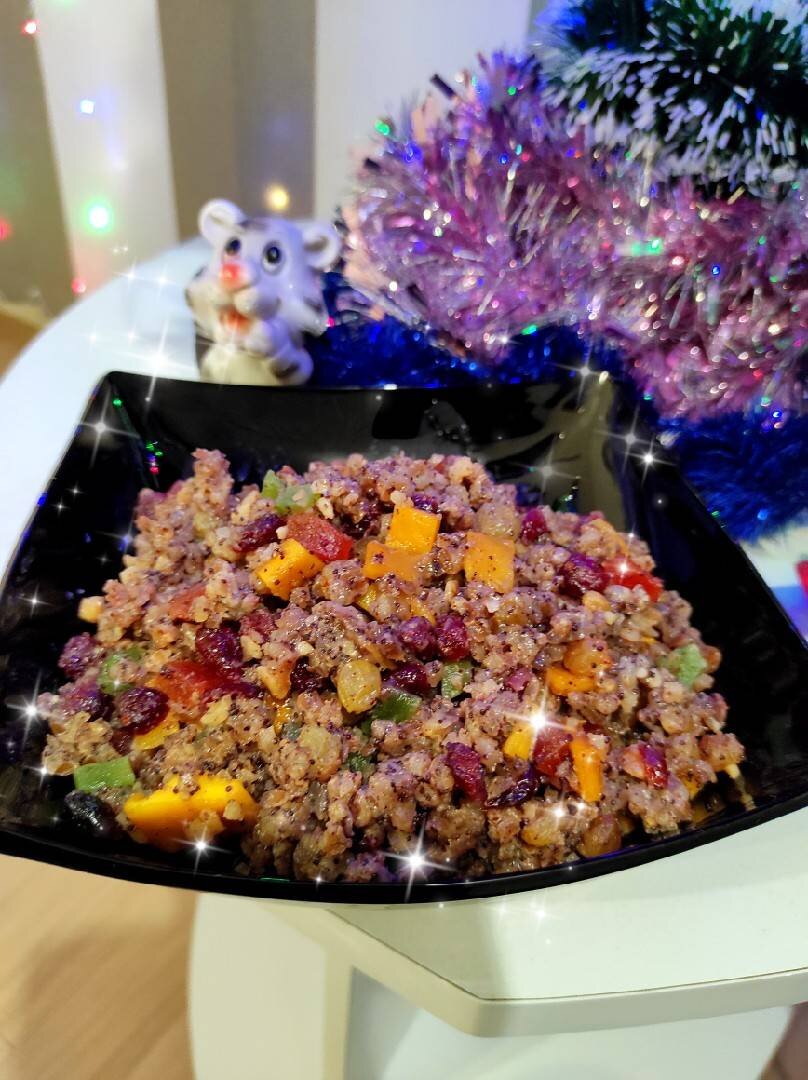 Обычно я никогда не делала кутью с маком, сегодня - это первый раз, получилось как никогда, очень вкусно 😋 #рождество #кутья #пшеница Ингредиенты: - домашняя крупная пшеница , - воды , - мака, - сахар песок, - мед, - изюм, - манго вяленое, - киви 🥝 вяленое, - папайя вяленая, - грецкий орех Способ приготовления: Подготовьте все продукты. Подготовим пшеницу. Вскипятить они стакана воды (750 гр), промыть пшеницу и подгрузить в кипяток, как только пшеница закипит, уменьшить огонь и варить на медленном огне до полного выкипания воды. Мак залить кипятком на минут пять, аккуратно слить воду, добавить сахар и взбить венчиком до белого мака. Выложить мак сверху на отварную пшеницу, добавить 100 гр кипятка и поставить томится в предварительно разогретую духовку на 1-1.5 часа при температуре 100°. Пока наша пшеница томится в духовке, порезать мелкими кубиками папаю, киви, манго. Подготовить изюм и клюкву. Орехи смолоть блендером, но не до муки)) Достаем нашу пшеницу, добавить изюм, клюкву, мёд