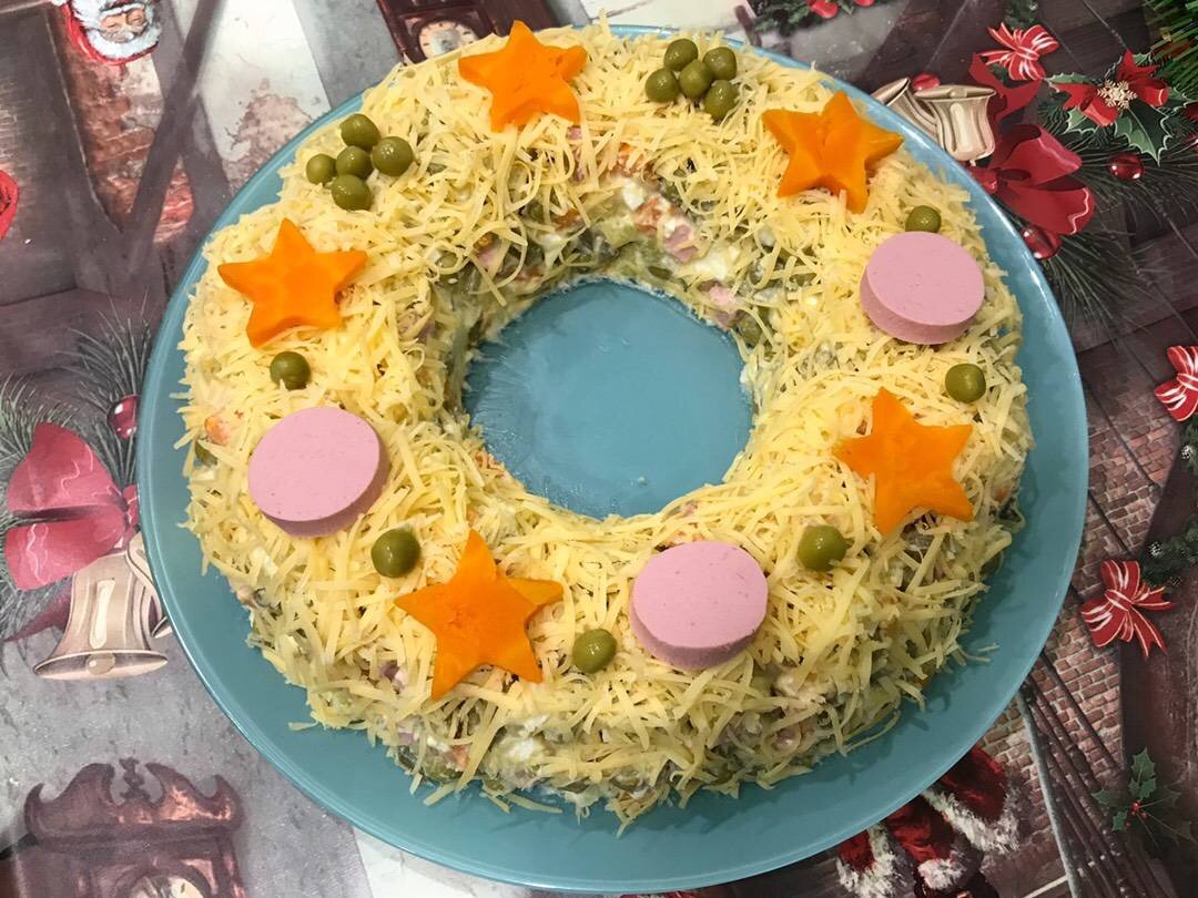 Ингредиенты: картофель, морковь, яйца, горошек, колбаса, соленый огурец, луковица, сыр, майонез Способ приготовления: Отвариваем и очищаем картофель, морковь и яйца. Нарезаем кубиками. Измельчаем лук. Огурцы и колбасу нарезаем кубиками. В миске смешиваем все ингредиенты и заправляем майонезом, перемешиваем. Лепим из массы венок, посыпаемся тертым сыром, украшаем по желанию.