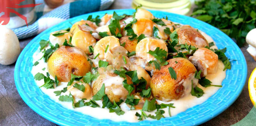 Рецепт: Морские гребешки с картошкой и грибами в сливочном соусе