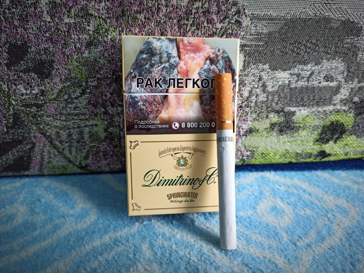 Всем доброго времени суток, друзья. Вот и дошла очередь ванильных Димитрино. Обычные зелёные мне очень понравились, я думаю, вы это поняли из статьи про них. Что из себя представляет ванильная версия? Сейчас разберёмся. Сперва стоит сказать, что пачка изменилась сильнее - раньше она была черного цвета, теперь же светлого. Ниже я покажу вам фотографию со старыми Димитрино для сравнения. Сами же сигареты никак не изменились. Тут классический пробковый фильтр, на котором расположено кольцо золотистого цвета. И надпись "Springwater", которая нанесена на саму бумагу. Некурительного обода здесь нет. Сама пачка прямоугольная, сделана весьма качественно. Конечно она выглядит проще чем раньше, но иначе бы и стоимость сейчас была совсем другой. К слову о стоимости - 260 рублей на 10.2021. А старые у меня 2017 года со стоимостью 270 рублей. С учетом того, что сами по себе сигареты никак не изменились по качеству, дело всё именно в пачке. И если бы ее не упростили, стоили бы они сейчас 300 или да