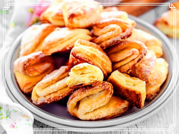 Добавить муку с разрыхлителем. Я советую всыпать не сразу всю муку, а грамм 400, остальную добавить по необходимости. Ее точное количество зависит от влажности и жирности творога. Тесто должно быть мягким, но не липким. Готовое тесто убрать в холодильник на полчаса. У меня оно там провело примерно час.