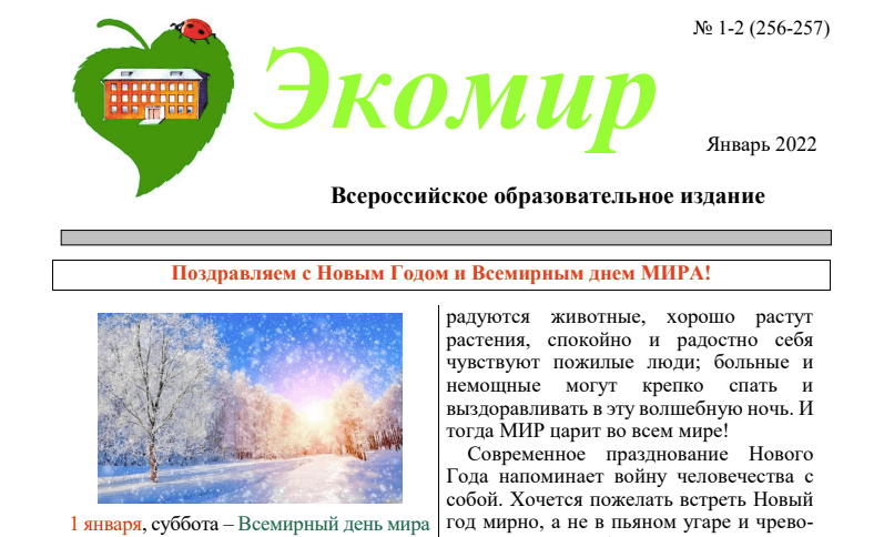 Предлагаем вашему вниманию новогодний номер газеты «Экомир», № 1-2 (256-257). Январь 2022. В номере: В приложениях: Читаем январский номер Всероссийского образовательного экологического издания «Экомир» >>> Редакция: В. Масалова, Е. Обухова, О.Н. Ридигер, С.М. Килина, Н.С. Пархоменко Редколлегия: Д.Д. Ридигер, О.Н. Ридигер, Станислав Макухин, И.А. Шапошникова, Э.С. Зиннатуллина, А.А. Черечукин Вёрстка: А.А. Черечукин Редакционный Совет: И.А. Шапошникова, В.П. Александрова, Н.П. Лой, В.В. Вашков, Т.С. Кулькова, О.Н. Ридигер, А.А. Черечукин Главный редактор: Ридигер Ольга Николаевна
