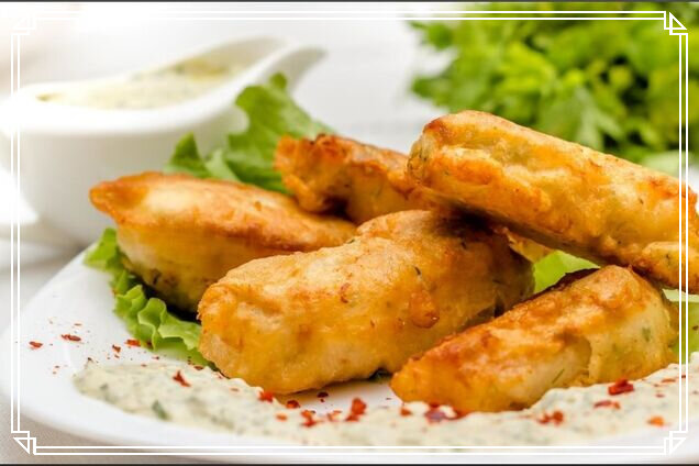 Ингредиенты: на 500 г готового филе - 5 ст. ложек муки, 3 ст. ложки растительного масла, 0,5 лимона, 2 яйца и 100 г жира для жаренья. Приготовить тесто в миске. Смешать муку и соль с 2 ст. ложками растительного масла, затем развести теплой водой( 0,5 стакана) так, чтобы не было комков. Миску с тестом накрыть и дать постоять. Рыбное филе нарезать кусочками толщиной 1 см и длиной 5-7 см, посыпать солью, перцем, нарубленной зеленью; отжать на рыбу сок 0,5 лимона, прибавить 1 ст. ложку растительного масла, перемешать и оставить так на 15-20 минут. За 10-15 минут до подачи на стол добавить в тесто 2 яичных белка, взбитые в пену; каждый кусочек рыбы взять вилкой и, обмакнуть в тесто, погрузить сильно разогретый жир. При обжаривания рыбы кастрюлю с жиром надо слегка встряхивать, чтобы кусочки рыбы покрывались жиром. Перед подачей на стол на подогретое (пустое) блюдо положить бумажную салфетку, поверх нее разместить пирамидой рыбу, украсить веточками петрушки. Отдельно подать майонез с
