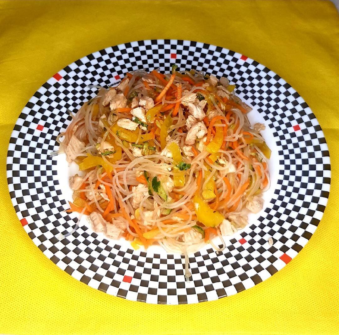Сегодня я поняла, что очень хочу фунчозу. И приготовила... Но по-своему рецепту. Получилось очень вкусно! Ингредиенты: Фунчозы, Моркови по-корейски, Филе индейки, Болгарского перца (жёлтого), Соевого соуса, Чеснока, Свежий огурец, Оливковое масло Способ приготовления: Фунчозу залить кипятком на 5-7 минут, затем отбросить на дуршлаг и промыть холодной водой. Огурец нарезать длинной тонкой соломкой или натереть на тёрке для корейской моркови. Жёлтый болгарский перец нарезать соломкой. Соединить лапшу с морковью, перцем и огурцом, добавить соевый соус. Филе индейки отварить, мелко нарезать. Или можно нарезать мелкими кусочками и обжарить. Кому как нравится. Добавить к фунчозе. Чеснок измельчить на чеснокодавке, перемешать с оливковым маслом, заправить салат и перемешать.