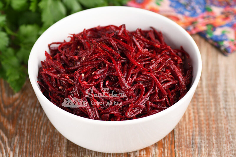 Обожаю салаты и закуски из свежих овощей. Они готовятся легко, просто и вариантов приготовления множество. Для них отлично подходят сочные овощи (капуста, помидоры, огурцы, перец) и овощи корнеплоды (морковь, свекла, редька, репа). Сегодня готовлю очень вкусную закуску (салат) из сырой свеклы. Она получается хрустящая, пикантная и прекрасно подходит к мясу или рыбе. Порции 300 г Время подготовки 10 минут Время приготовления 3 часа Ингредиенты Инструкции 1. Для приготовления подходит свекла любого размера. Промываем ее и очищаем. 2. С помощью терки для корейской моркови натираем свеклу тонкой соломкой (это быстрый вариант). Можно еще нарезать и ножом, но получится чуть дольше. 3. Добавляем в свеклу соль, сахар, масло, уксус и мелко нарезанный чеснок (он дает остроту и отличный вкус). 4. Для приготовления использую готовую приправу для корейской моркови. У нее натуральный и сбалансированный состав специй, за счет этого салат получается в меру острый и очень ароматный. 5. Свеклу хорошо п