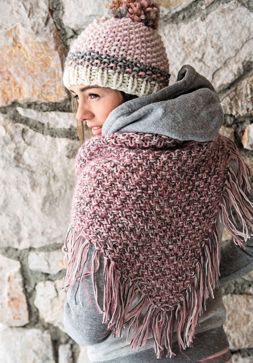 Простой и теплый платок с бахромой связан жемчужным узором на толстых спицах. Размер 76,5 x 48,5 см (без бахромы) Вам потребуется Узоры и схемы Основной узор Большой жемчужный узор. Число петель кратно 2 + 1. Вязать попеременно 1 лицевая, 1 изнаночная, закончить 1 лицевой. Узор смещать в каждом 2-м р. Плотность вязания 9 п. х 14 р. = 10 x 10 см, связано основным узором в пять нитей (= по 1 нити каждого цвета пряжи 1 и 2 и 2 нити пряжи 3) на спицах №12. Внимание! Платок начать вязать с угла. Выполнение работы На спицы №12 в пять нитей (= по 1 нити каждого цвета пряжи 1 и 2 и 2 нити пряжи 3) набрать 3 п. и вязать основным узором. Для скосов в каждом 2-м р. с обеих сторон прибавить 33 х 1 п. = 69 п. Через 48,5 см = 68 р. от наборного ряда все 69 п. свободно закрыть. Сборка По скошенным сторонам платка прикрепить бахрому. В готовом виде длина каждой кисти бахромы составляет 15 см и состоит из 5 нитей (= по 1 нити каждого цвета пряжи 1 и 2 и 2 нити пряжи 3). Источник: журнал «Burda