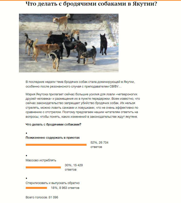 В местной интернет газете Якутии проводят опрос на эту тему Что делать с бродячими собаками в Якутии?https://sakhalife.ru/chto-delat-s-brodyachimi-sobakami-v-yakutii/