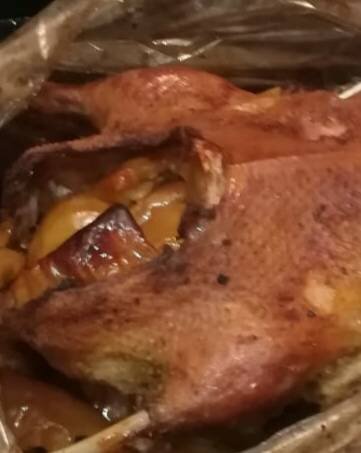 #рождество #уткасяблокамиичерносливом #праздничнаяутка Ингредиенты: Утки, Яблоки, Чернослив, Клюквы свежей, Чеснока, Сметаны, Соль, Перец чёрный молотый Способ приготовления: Приготовить ингредиенты. Заранее готовую тушку утки обмыть холодной водой и обсушить вискозной салфеткой, натереть солью и перцем чёрным молотым внутри и снаружи. Для маринада : Свежую клюкву перебрать, удалить мусор, помыть водой, поместить в дуршлаг, чтобы отекла, протереть через сито. Очистить зубчики чеснока, раздавить через чеснокодавку. В ёмкость со сметаной добавить сок клюквы, чеснок, перемешав, обмазать густо тушку утки снаружи и внутри и поместить в пакет для запекания, завязав.. Положить мариноваться в холодильник, лучше на ночь. Чернослив залить горячей водой минут на 10-15, пусть набухнет, затем поместить в дуршлаг, пусть отекает. Яблоки помыть, обсушить, удалить коробочку с семенами, разрезать на части, в зависимости от размера яблока. Смешать дольки яблок с черносливом. Достать маринованную утку в п