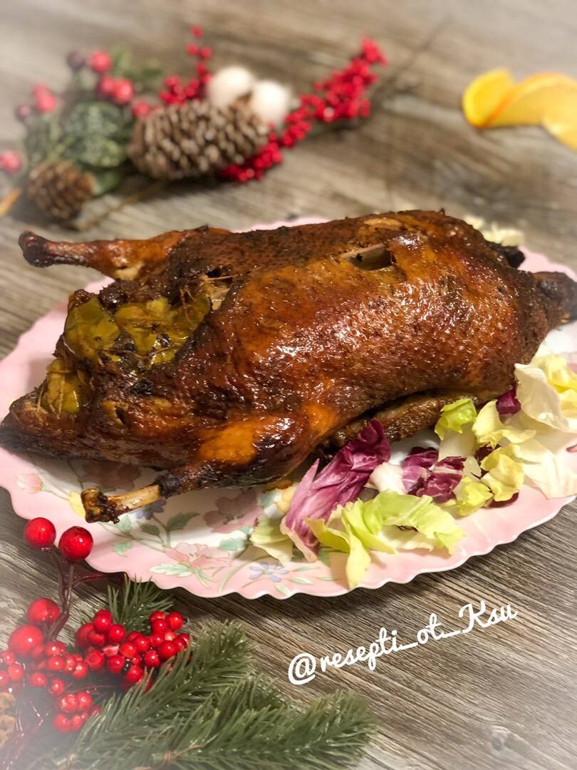 Утка с яблоками и апельсинами станет коронным блюдом на вашем праздничном столе. Она украсит любой праздничный стол. Утка получается нежной и очень вкусной с цитрусовой ноткой. #новыйгод #рождество Ингредиенты: утка, зелёных яблок, чеснока, апельсина, Специи по вкусу, Соль, Душистый перец, Сушёный розмарин, Чёрный перец Способ приготовления: Подготавливаем необходимые ингредиенты: утку промываем под холодной водой и обсушиваем бумажными полотенцем. Фрукты хорошенько промываем и нарезаем на дольки. Натираем утку специями сверху и внутри. Внутри выдавливаем сок апельсина, далее фаршируем яблоками и апельсинами, зашиваем. Выкладываем в рукав для запекания, завязываем и ставим мариноваться в холодильник на ночь. На следующий день достаём и выпекаем в разогретой духовке при 200°C 1,5 часа, затем утку аккуратно переворачиваем не разрезая рукав и ещё запекаем 30 минут при 150°C. ❗️Время запекания зависит от размера уточки и Вашей духовки.❗️ Чтобы утка получилась с хрустящей корочкой за 10 мин