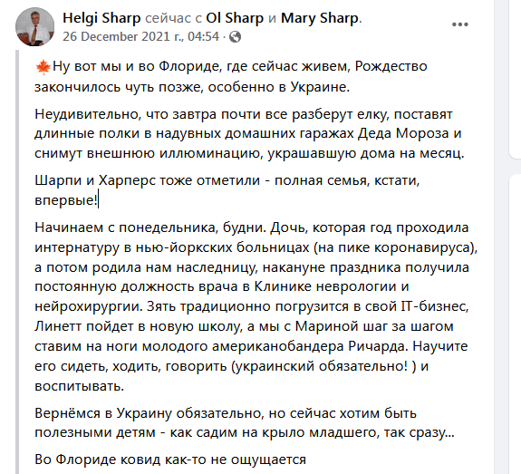 Почему я не удивлена, что этот человек ведет свою пламенную борьбу из Флориды, а не стоит на морозе под окнами администрации нынешнего украинского президента в толпе ожесточенно протестующих? Именно там стоически продолжает не прогибаться под Московию практически в одиночку (цитата Sharp`s). Хотя семья, как мы видим, под боком.