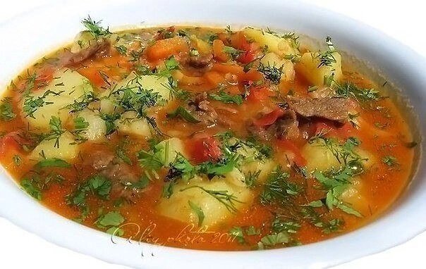 Этот суп пришел к нам с Востока. Он прост в приготовлении и порадует вас и ваших близких своим насыщенным ярким вкусом Ингредиенты: ●Баранина шейка 0,5 кг ●Лук репчатый 1 шт ●Перец сладкий красный 1 шт ●Морковь 2 шт ●Картофель 6 шт ●Чеснок дольки 2 шт ●Кинза 10 г ●Укроп 10 г ●Помидор свежий 2 шт Приготовление: 1. Выбираем кастрюлю (или казан) объемом 6-7 литров. 2. Лук нарезаем мелкими кубиками и обжариваем на растительном масле до золотистого цвета прямо в кастрюле. Важно, чтобы на протяжении всей готовки огонь был очень умеренный - меньше среднего. 3. Добавляем нарезанное кусочками мясо и обжариваем его. Мясо пустит сок и будет слегка тушиться. 4. Морковь и болгарский перец нарезать соломкой и сразу добавить к мясу. Вместе с этим добавляем часть или один целый острый перчик (зависит от того какую остроту супа вы предпочитаете) 5. Затем добавляем нарезанный крупными дольками помидор, еще раз перемешиваем и заливаем все горячей водой - чуть больше половины кастрюли. Накрываем крыш