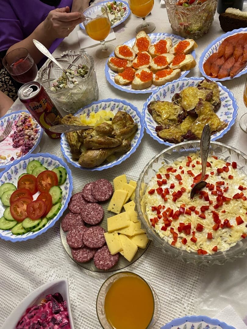 Добрый день! Хочу поучаствовать и рассказать как мы, четыре пенсионера отметили Новый год и что приготовили на стол. Почему четверо. Это мы четыре соседки пенсионерки. Две одинокие и у двоих дети взрослые, свои семьи. Вот мы и решили посидеть у одной из нас. Не одиноко и вскладчину дешевле. Посидели очень душевно. По телевизору только призедента посмотрели и всё. Было о чем поговорить. Одна из нас даже на гармошке играла, песни пели,жгли огни бенгальские. Стол мы решили сделать хороший. Пенсии маленькие, но раз в год можно себе позволить. Сбросились деньгами, купили нужные продукты. Готовил каждый у себя дома. Салатики были традиционные Сельдь под шубой, Мимоза, Оливье. Ну и Летний. (Огурчики +помидоры). На горячее мясо с сыром и голени. Гарнир картофель пюре. Позволили себе бутерброды с икрой, рыбку красную и колбасу хорошую. Сидели до 5 утра. 1 января снова собрались и пошли на улицу гулять а потом чай пили с Прагой. Марафон историй. История 9