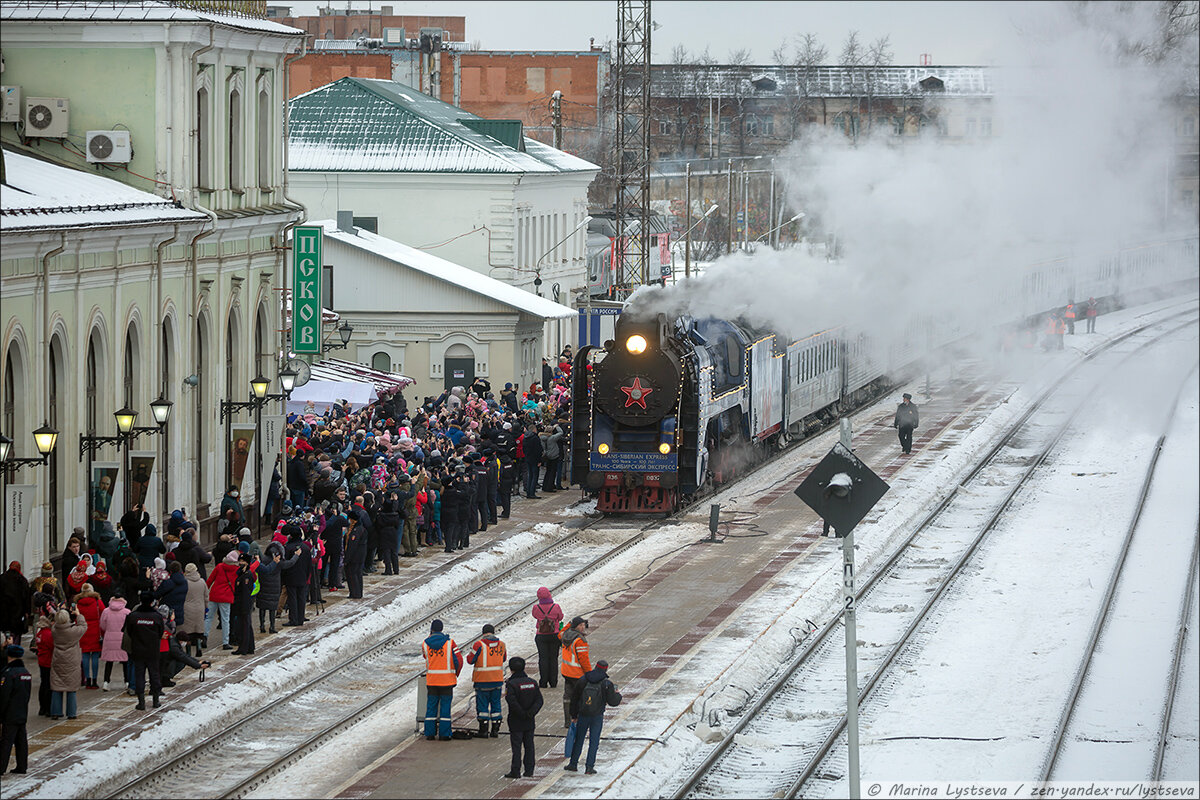 Поезд с главным российским зимним персонажем начал своё путешествие по России 5 декабря. В его плане 37 городов, в которых он делает небольшие остановки и по специально купленному билету каждый может поучаствовать в развлекательной программе на вокзале или привокзальной площади. Мы на январские каникулы выбрались а несколько дней в Псков и область, а заодно встретили этот поезд на ж-д вокзале в Пскове. Билет, конечно же, покупать не стали – это для маленьких детей, нам было интересно посмотреть на сам паровоз и как он дымит и гудит. В этом видео есть звук, который наложен на фотографии прибытия, т.к. картинка записалась нерезко: Поезд прибыл чётко по расписанию – даже на пару минут раньше назначенного времени. Ещё издалека машинист начал пускать дым и сигналить, оповещая о визите. Выглядело красиво... Мы наблюдали за прибытием с пешеходного мостика над путями, где собралось ещё человек 100 зрителей с детьми – вид сверху почти всегда лучше. На второй платформе стояло несколько полиционе