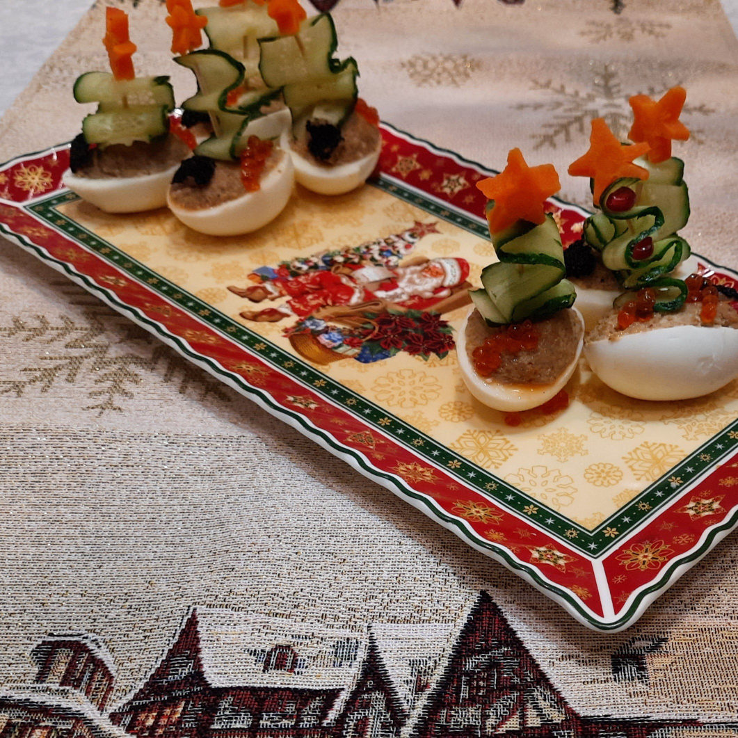 #презентація #канікули Ингредиенты: куриная печень, куриных яиц, маленький лук, Оливковое масло для жарки, майонез, огурец для украшения, морковь для украшения, Красная икра, Маринованный трюфель, Зернышки граната Способ приготовления: Яйца отвариваем. Разрезаем на половинки. Лук мелко нарезаем и обжариваем на растительном масле. Печень моем, солим, обмакиваем в муке и обжариваем на растительном масле. Измельчаем в блендере лук, печень и желтки. Добавляем майонез. Фаршируем яйца полученной смесью. Огурец моем и нарезаем тонкими слайсами. На зубочистке формируем ёлочку. Из морковки вырезаем звёздочку. Можно украсить зернами граната, икрой и маринованным трюфелем.