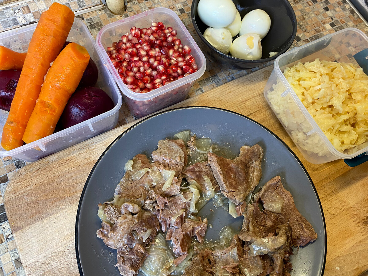 Салат, о котором пойдет речь приготовила моя мама на новогодний стол. Жена влюбилась в этот салат с первой ложки и утро первого января начала именно с этого салата, а потом ела на протяжении всего дня и вечера...и ночи. Салат понравился ей настолько, что она решила приготовить себе целый тазик на рождество. А я не долго думая решил нафоткать процесс и выложить на канал. Салат "Браслет" Кстати, я называл этот салат как угодно, от кольца до сфинктера, но только не браслетом. Для приготовления нам нужно сварить пол кухни много вещей: свекла, морковь, яйца, картофель, мясо/курица, гранат (его не нужно варить). Так же нам понадобится немного дробленого грецкого ореха и жареный лук. Подготовка и чистка ингредиентов - самая долгая часть готовки. Дальше все делается быстро и просто. Берем большую круглую тарелку (не глубокую), ставим в центр тарелки банку или стакан и натираем овощи на терке вокруг этой банки. А каждый слой смазываем майонезом. Логично было бы предположить, что если салат н