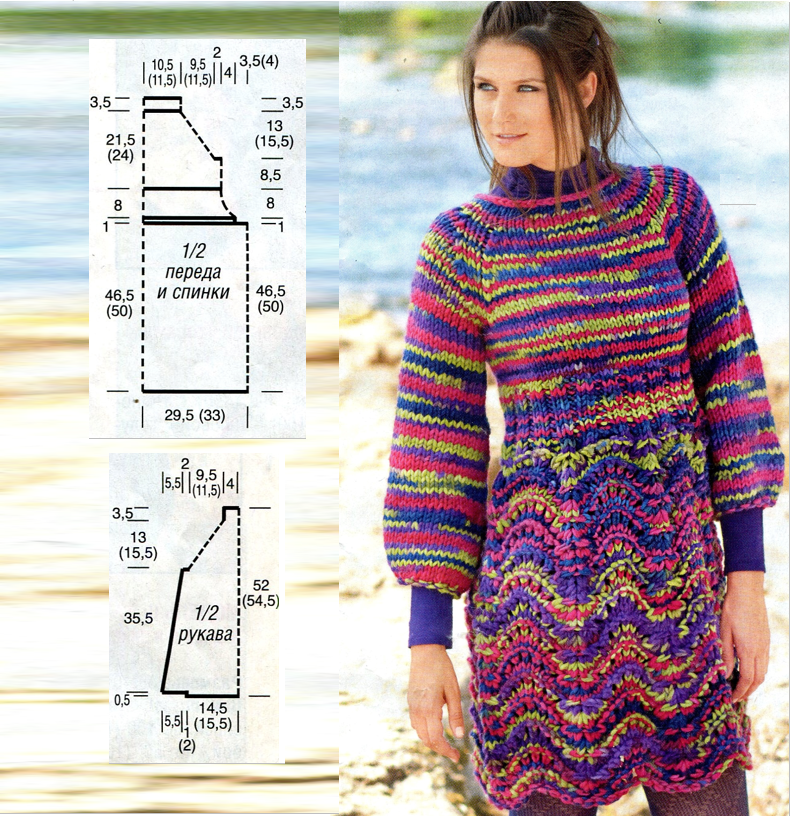 Добрый день, читатели. Пестрое платье с рукавами “баллон” с размерами 36/38 (42/44). Для реализации задуманного потребуется 800 (900) г пряжи Feltro print пестрых лиловых цветов. Работу выполняем прямыми и круговыми спицами № 9. Набор узоров на снимке. Для вязания спинки и переда набираем 136 (153) петли крестообразным набором. Теперь заключаем набранные петли в круг, и вместо относящегося к крестообразному набору изнаночного ряда, вяжем один круговой ряд лицевыми петлями. В дальнейшем этот ряд не учитываем в расчетах. Переходим к вязанию 8 (9) раппортов волнистого узора до высоты работы 46,5 (50) см или 56 (60) кругового ряда. Теперь делаем переход из 1 см или 1 кругового ряда лицевых петель. После перехода в каждом раппорте провязываем вместе средние 3 петли лицевой петлей. Остается 130 (135) петель. Выполняем планку для талии из 8 см или 12 круговых рядов резинки, при этом во 2-м круговом ряду провязываем в каждой полосе из изнаночных петель 2-ю и 3-ю петли вместе изнаночной петлей