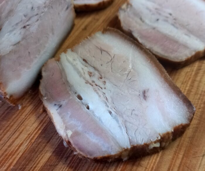 Во время новогодних праздников купить хорошее мясо не так-то просто, во всяком случае не далеко от дома. Запас соленой грудинки закончился и купила то, что было. Кусочек так себе. Перемороженный, кожица жесткая как кора дерева. Эх, куда глаза смотрели? Сухой засол тут не подойдет, а вот горячий позволить оживить грудинку, которая не так уж и плоха, на самом деле. Вообще-то этот способ подходит для любого дешевого мяса и сала и позволяет превратить его во вкуснейшую закуску Разрезаю грудинку на три порционных подходящих кусочка Специи: сладкая паприка, острый чили, черный перец, кориандр Кусочки грудинки хорошенько натираю смесью специй и солью Кусочки тщательно заворачиваю в пищевую пленку, стараясь не оставить внутри вздух. Можно еще положить на кусочки грудинки лавровый лист Второй слой пищевой пленки накладываю как бы поперек первого и хорошенечко закручиваю и завязываю концы Кусочки складываю в кастрюлю с водой и ставлю ее на огонь Как только вода начнет закипать наступает важный м