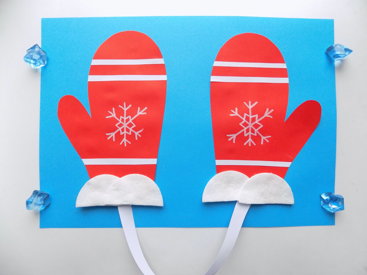 Осталось снова воспользоваться белой бумагой. Из нее вырезаем длинную полоску шириной примерно 1 см. С ее помощью соединим 2 варежки, закрепив кончики полоски под каждой.