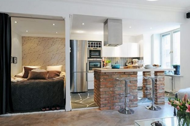 Необработанные стены в интерьере - часто повторяющаяся тенденция. О том, что за ней стоит ухаживать мы говорили уже не раз, но представить то, что вы увидите через мгновение нас побудила не только новизна, но и не большая площадь квартиры. Интересно также то, как в маленькой студии обустроена спальная зона. Необработанные стены в интерьере - часто повторяющаяся тенденция. О том, что об этом стоит позаботиться, мы уже говорили много раз, однако представить то, что вы сейчас увидите, нас побудила не только новизна, но и небольшая площадь квартиры. Интересно также то, как в маленькой студии позаботились о спальной зоне. Голые кирпичи нашли свое применение на кухне. Они были использованы для строительства бара, который также служит островом. В таком маленьком помещении нет места для отдельных комнат. Единственное место, где нам удалось выделить пространство - это спальня. Правда, отдельной комнатой это назвать сложно, так как там стоит только кровать, отделенная занавеской от остальны