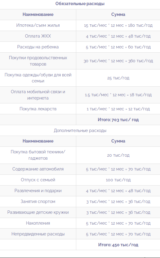 Если же учитывать необязательные, но всё-таки желательные, расходы для комфортного проживания, получается сумма 1 153 000 рублей в год, иначе 96 тыс. в месяц.
