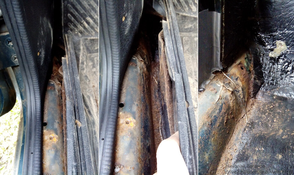 Как вы помните, недавно менял уплотнители передних дверей, а так как снимал пластиковую накладку порога, то решил под нее заглянуть.