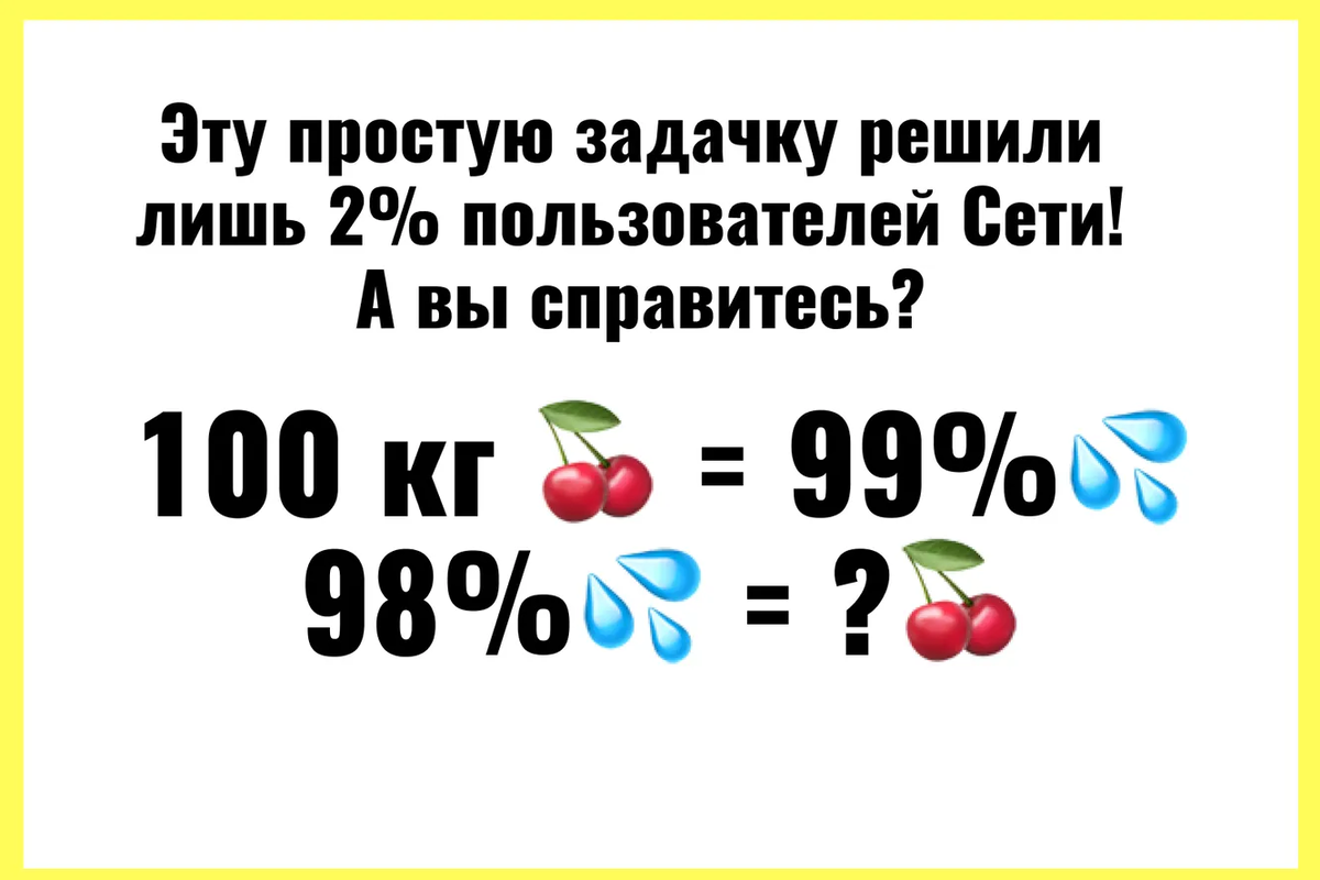 Есть 100 кг ягод, 99% веса которых составляет вода. Из-за продолжительного хранения содержание воды в ягодах сократилось до 98%. Сколько теперь весят ягоды?